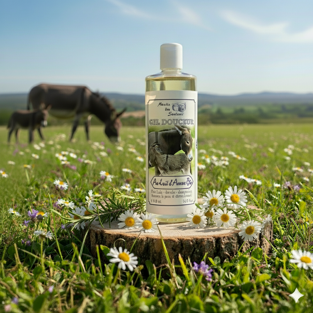 Notre gel douche au lait d'ânesse bio parfum "fleur de coton" est l'ami protecteur des peaux délicates.